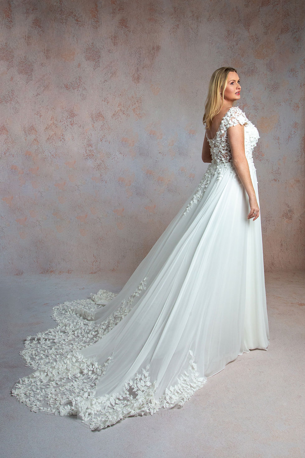 WP803-Chiffon Wedding Dress with 3D Trailing Lace Sheer Lace Cap Sleeves