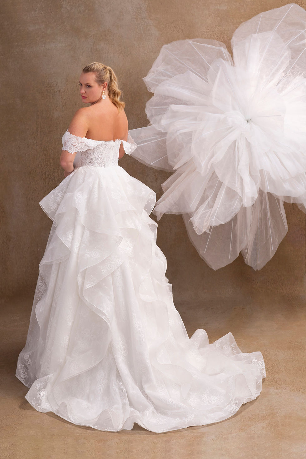 WP793-Plus Size Waterfall Lace Ball Gown Wedding Dress with Detachable Straps
